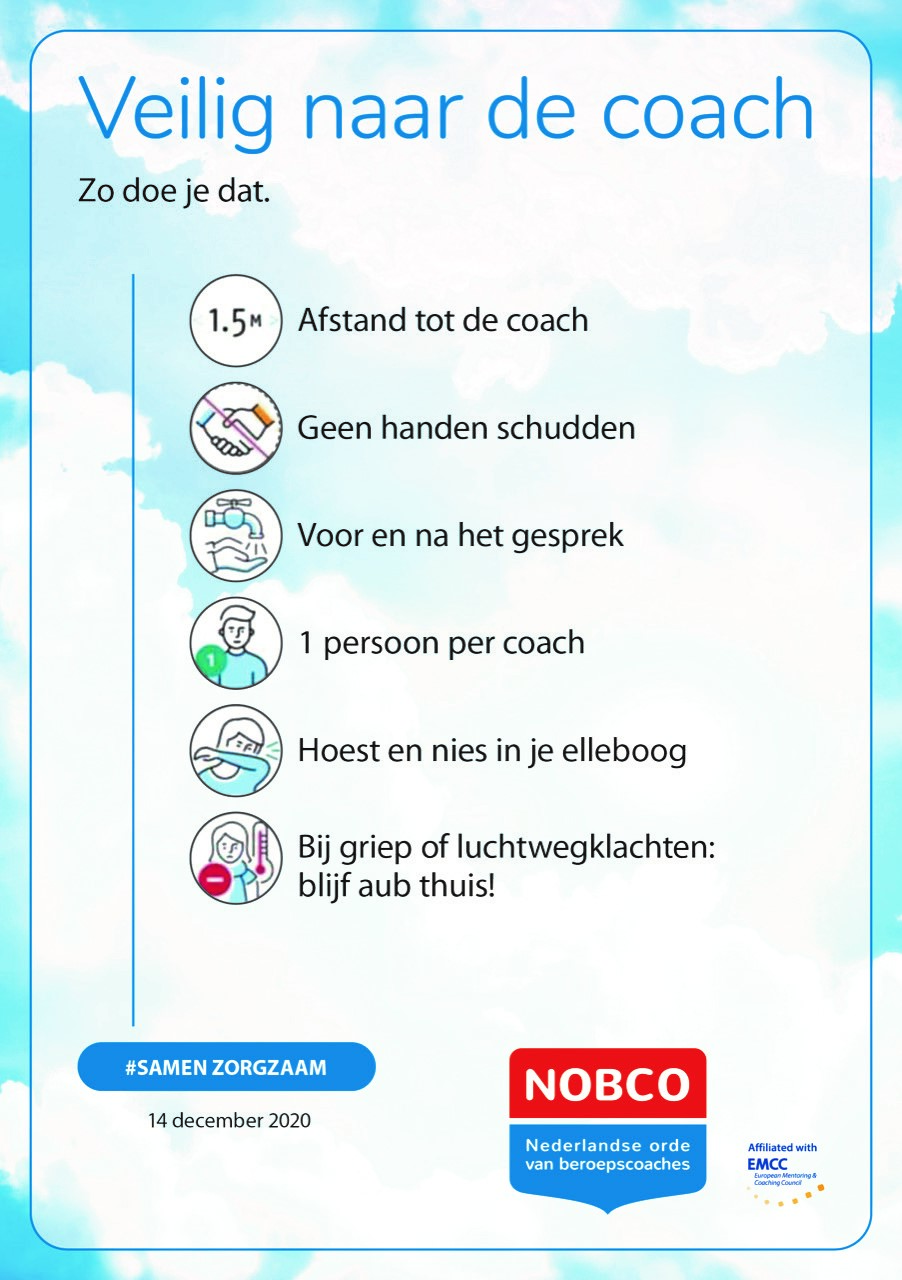 De lockdown heeft een behoorlijke impact. Heb je ondersteuning nodig in de vorm van coaching? Dat kan. Ik hanteer de richtlijn van NOBCO (zie infographic) en neem de volgende aanvullende maatregelen: